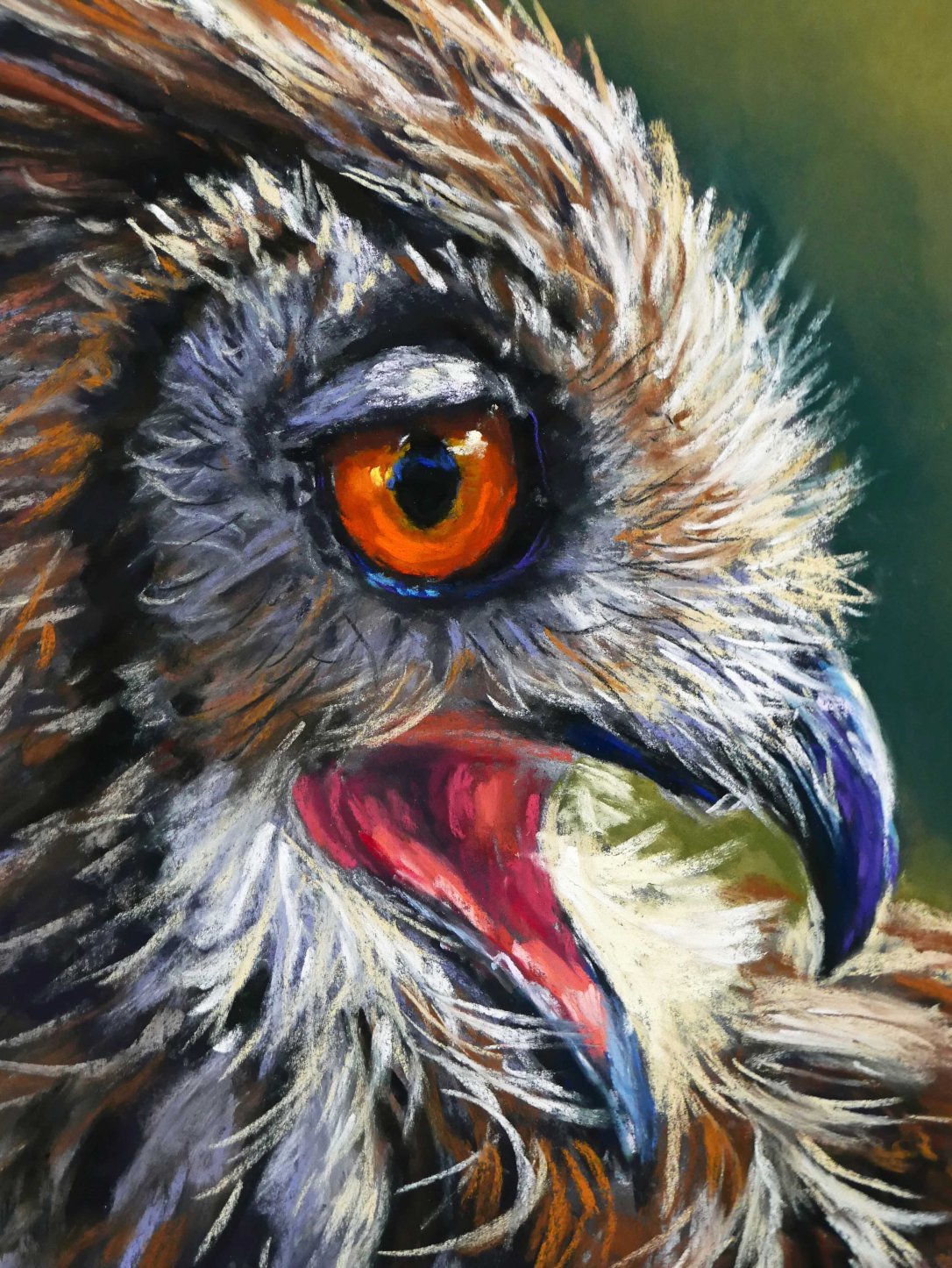 Catherine had obtained a detailed photo of a bird of prey and worked on sandpaper. She put dark colours in first, pushed the pastels of the background in with her hand and rested the little finger on the paper when drawing details to steady her hand. Catherine constantly explained each step of her work and an unbelievable image emerged in front of the amazed audience.