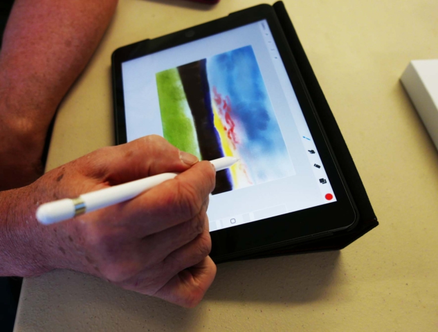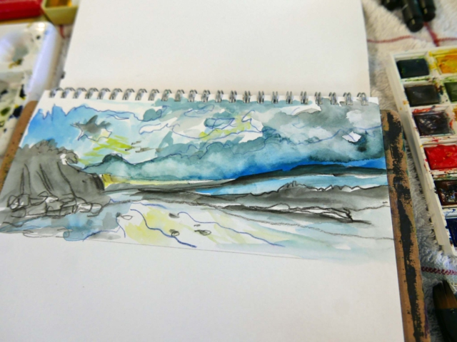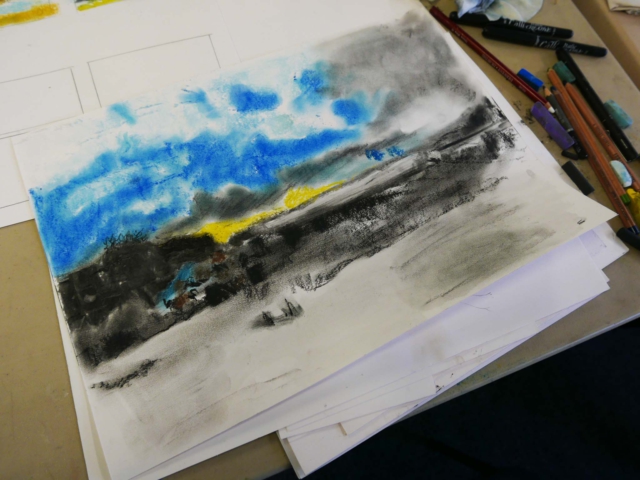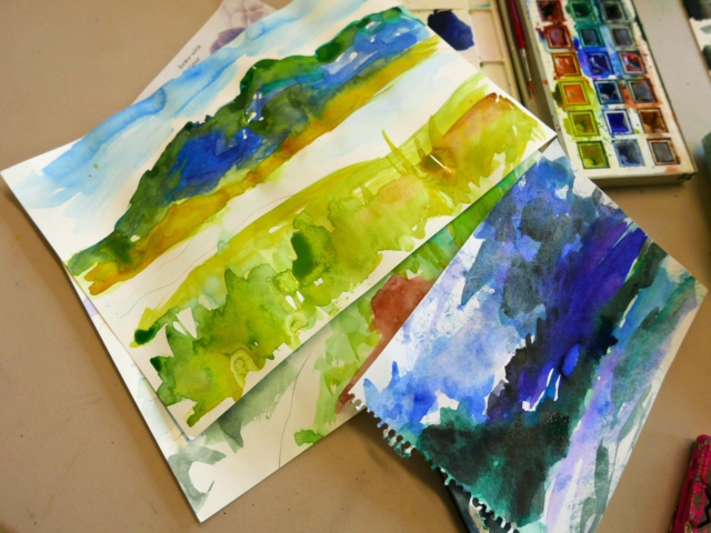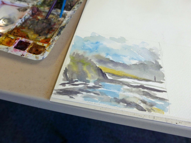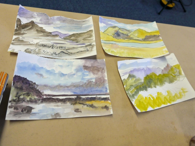 Halifax Art Society members had a very interesting time at a workshop run by visiting artist, Dorothy Simister, on Friday, 25th February. We had to work very quickly to do a series of watercolour sketches from photographs that Dorothy had taken on her travels around the UK and Europe – she only allowed us a few minutes for each sketch before changing the picture! Dorothy brought a big pile of her own sketchbooks to look at. She never travels without her sketchbook and paints!