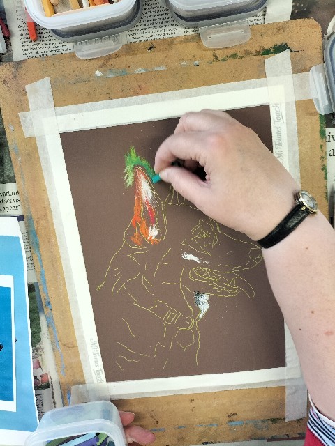 Last Friday our chairwoman Lynda Thomas had done everything to make the morning of the Queen’s jubilee memorable: There were displays of different memorabilia, photos, even of different dogs. We just brought paper or even sandpaper and pastels and it was astonishing what great work our members created in such short time.