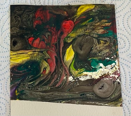 Lynda placed small drops of different coloured ink on the surface of the solution and created a design using a toothpick. She placed a piece of card on the surface and then took it out to dry. The result is quite striking.