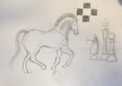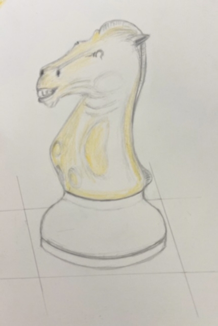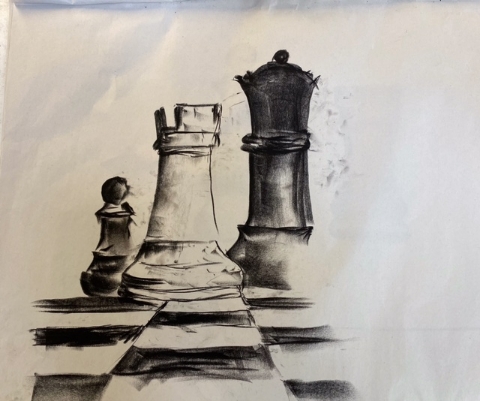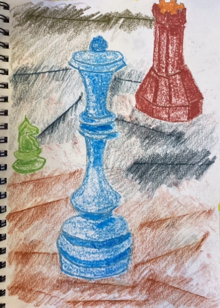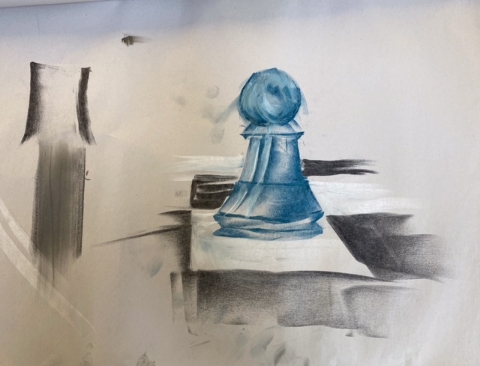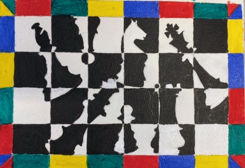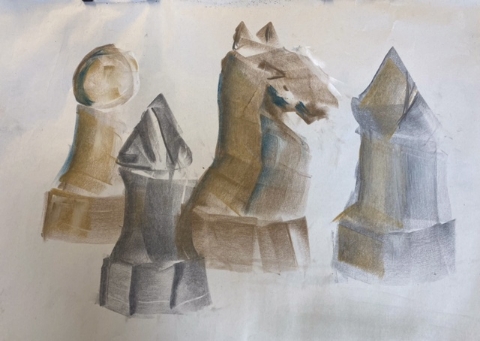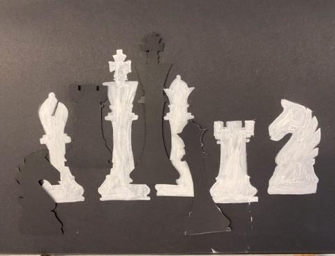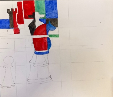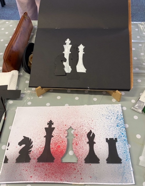 The shape and colour workshop led by Lynne was about black and white chess pieces. Lynne provided many examples of other artists works and different chess objects which helped to inspire members to produce some stunning work.