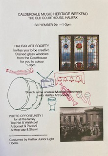 Please come along and meet this talented group of people who will show you how to draw musical instruments and maybe colour in a stained glass window template. In our fancy dress corner there are props and costumes ready for you – try on a top hat and waistcoat, a bonnet and parasol, a mop cap and shawl or any combination. Thank you to the Halifax Junior Light Opera for loan of the costumes. Colouring sheets and pencils are provided.