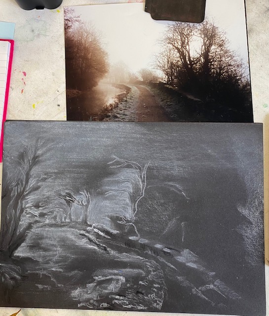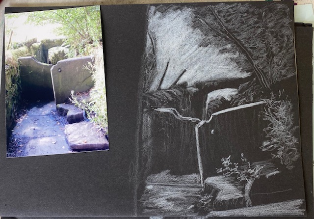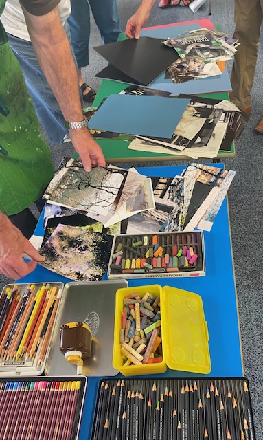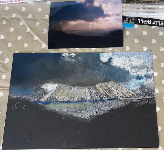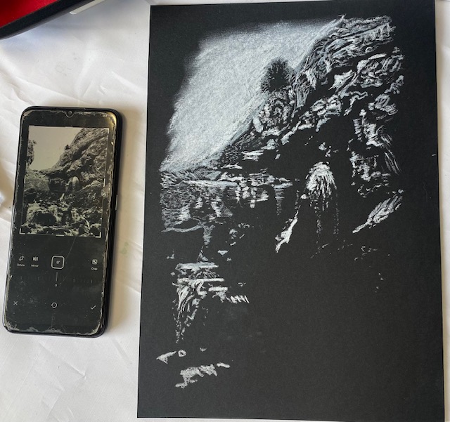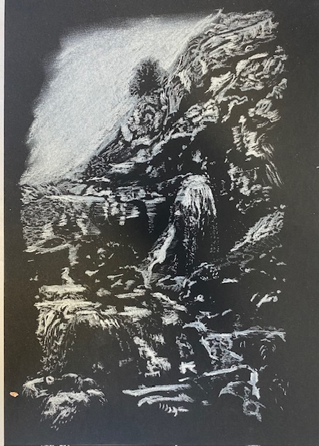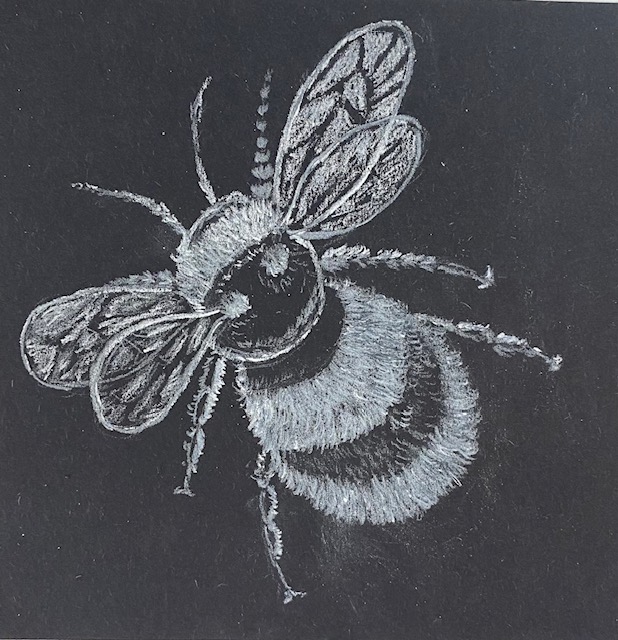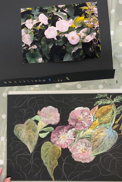 8th September 2023 – Due to a last minute change to the schedule, Carol stepped in to lead an interesting and enjoyable workshop. Carol gave hints and tips for drawing with white chalk, pencil or pastel on to black paper. She brought in examples to demonstrate the different techniques that can be applied.