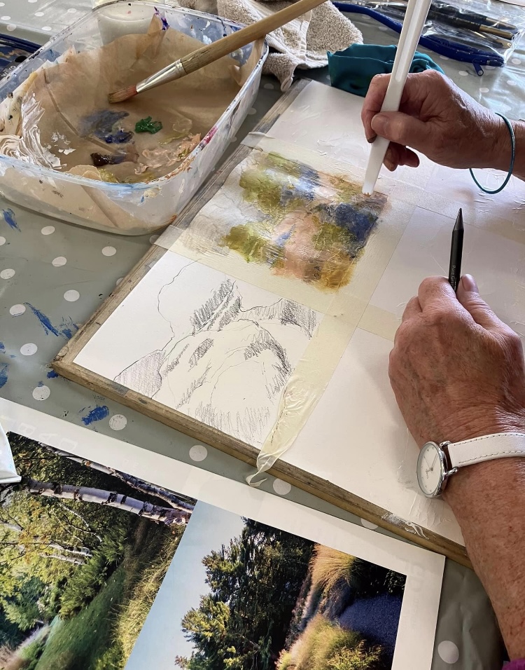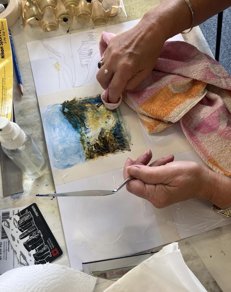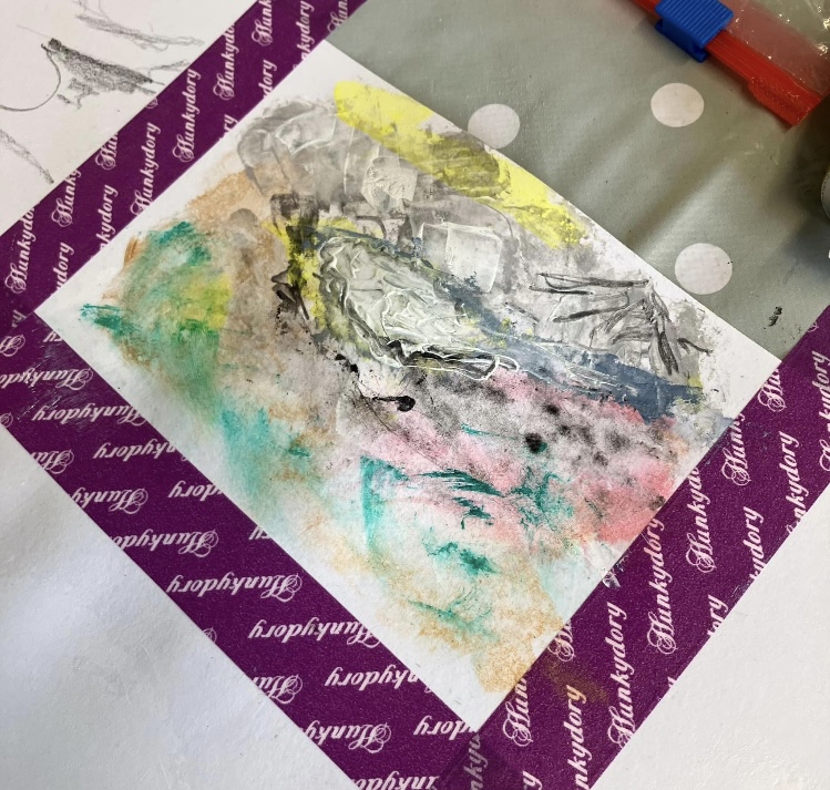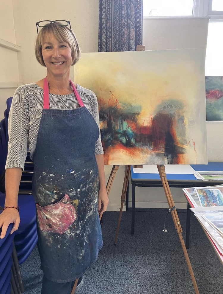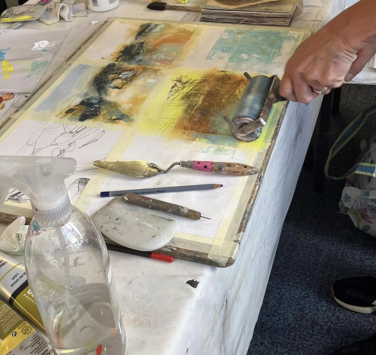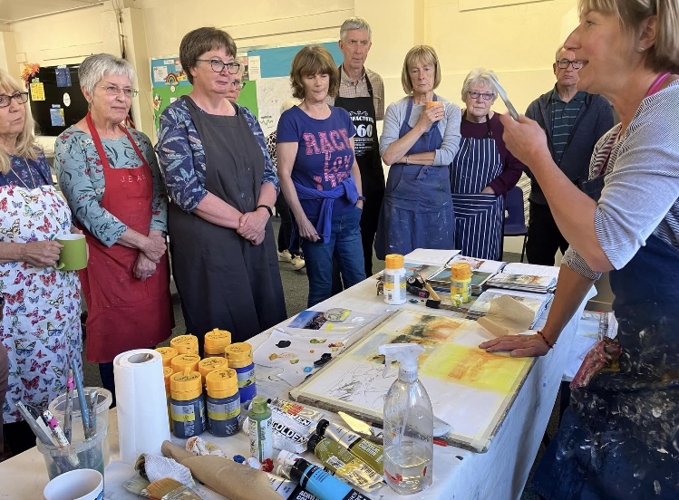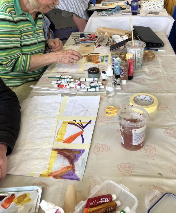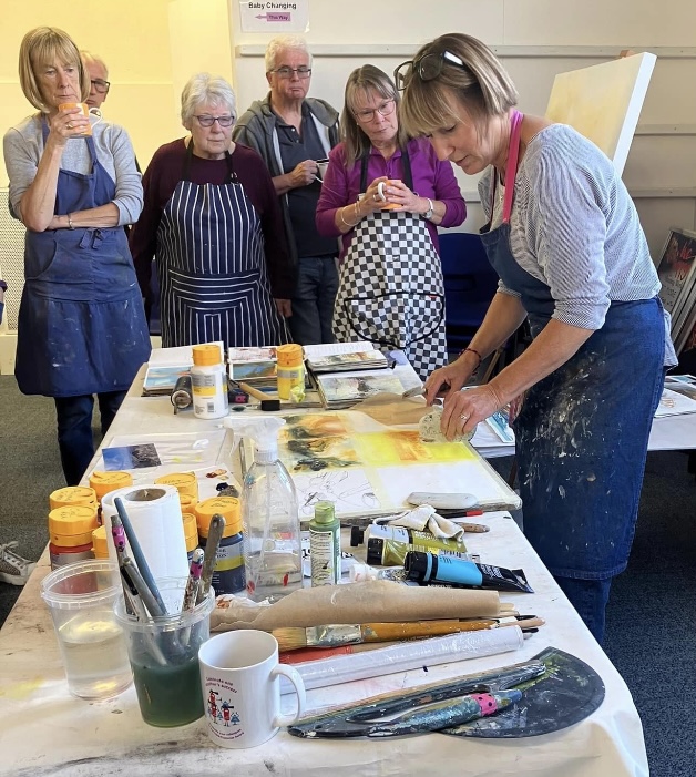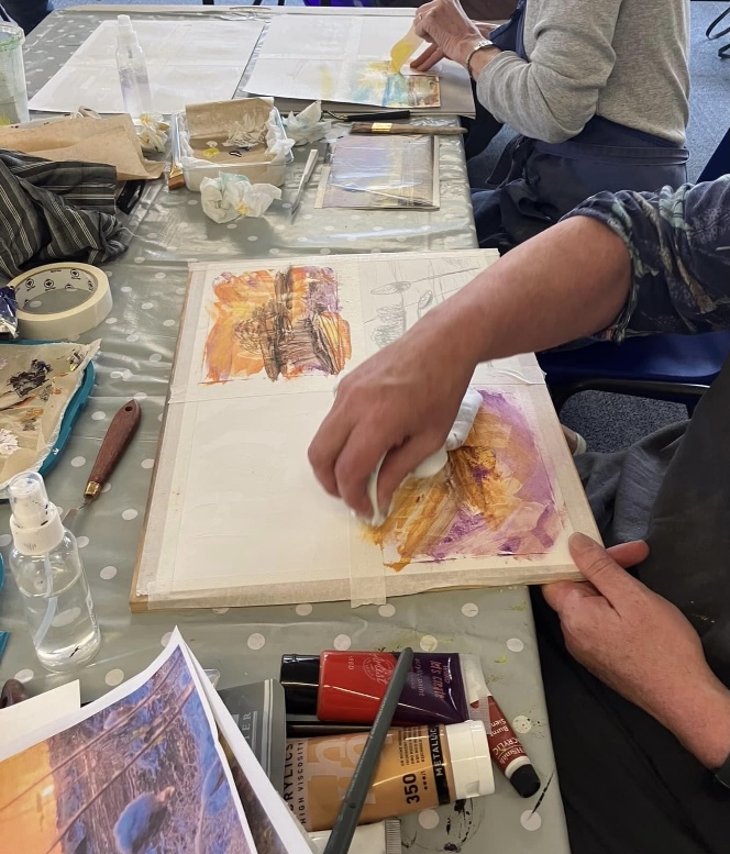 23rd August 2024 – As part of our Abstract themed August, Dean Clough artist Claire Murray came to show us some techniques for abstracting landscapes. So many methods, equipment and ideas that she brought had made this an amazing workshop, members were all so inspired.