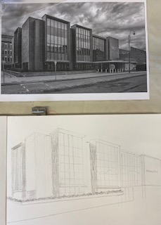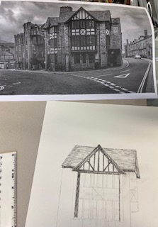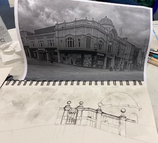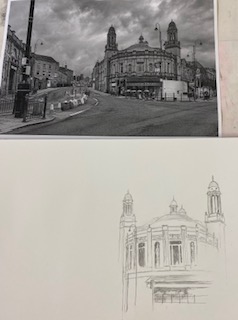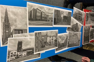8th November 2024 – Lynda brought in a lot of black and white photographs, taken by David Williams at the Calderdale Industrial Museum, that depicted some of the many beautiful buildings around Halifax town centre. Members enjoyed the challenge of recreating the very intricate and interesting details of the buildings.