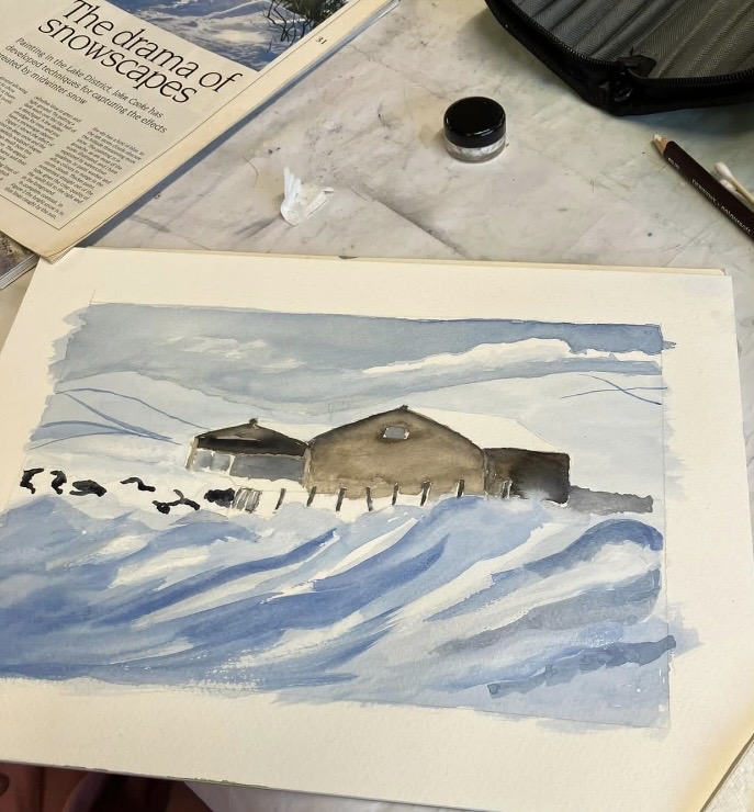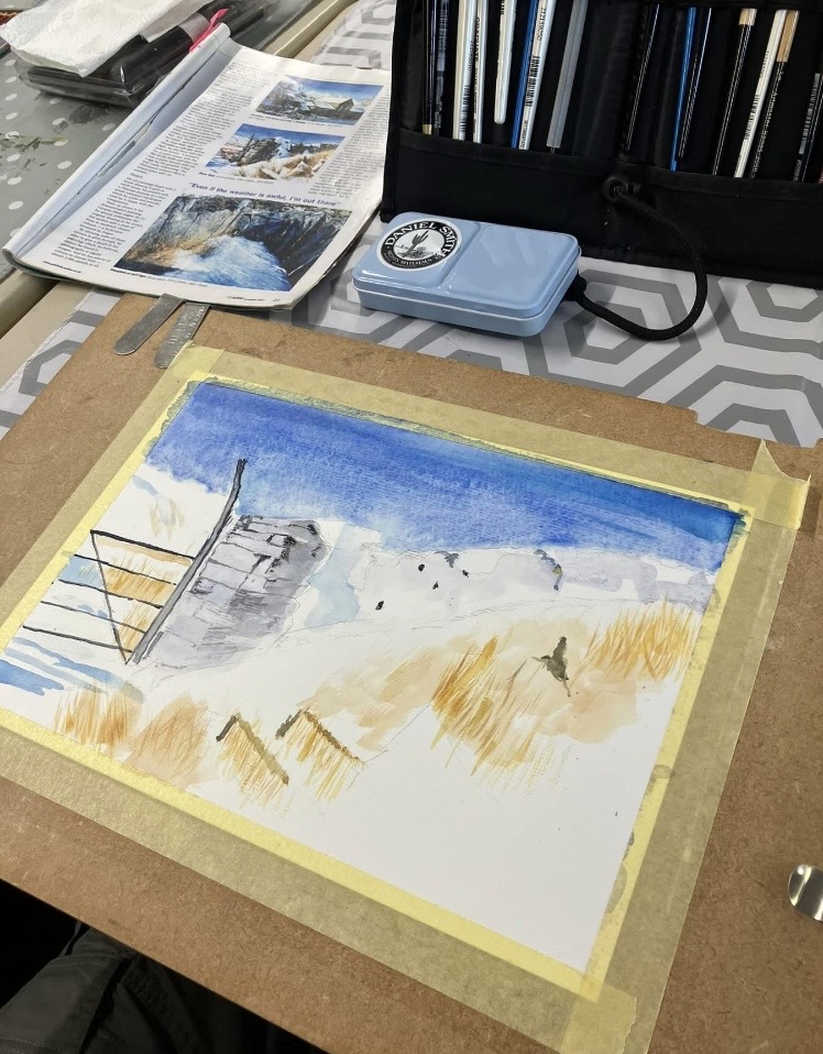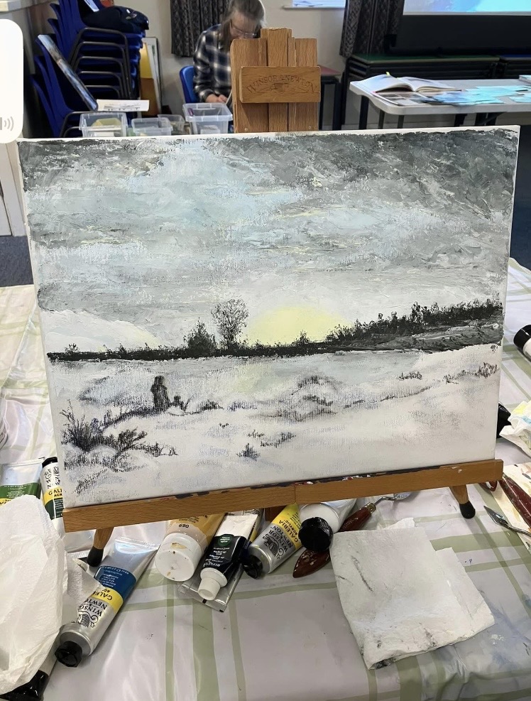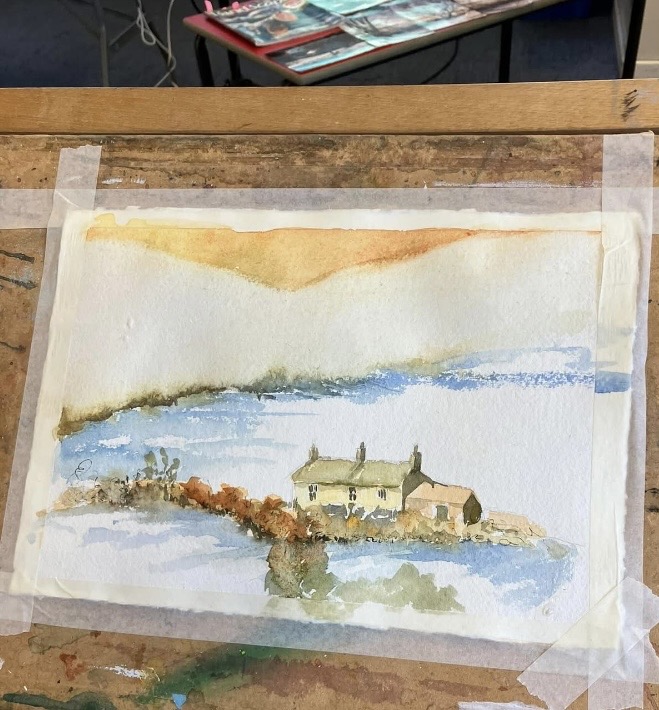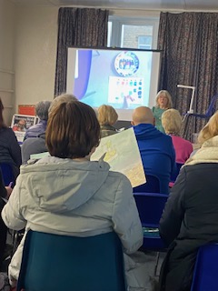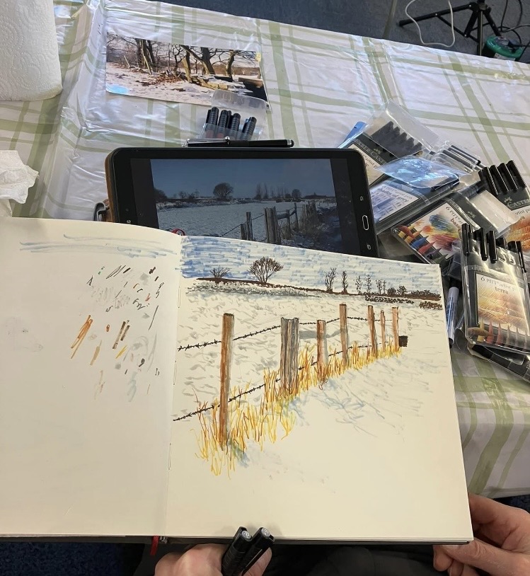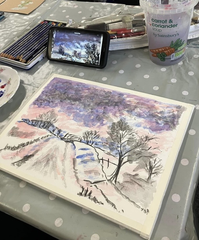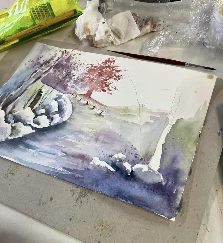 30th January 2026 – We welcomed back Jane who demonstrated painting a water feature from a photograph in watercolour. Jane explained how she outlines the picture first, applies masking fluid to areas she wants to keep white, prepares a page of the colours and colour mixing she will use. She also gave members lots of ideas, tips and techniques to create different effects, especially when painting water.