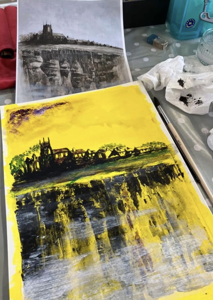 1st August 2025 – Janet led this workshop and invited Polly and Ian from the Playhouse to talk about the theatre’s history. We learnt about how the Playhouse started out to the many different/diverse productions delivered today. We were treated to an amusing performance from one of Michael Frayn’s Pocket Playhouse pieces, ‘The Corrected Version’. Members were then challenged to paint one of the many programmes brought in, some of which will hopefully be displayed at the next paintings changeover at the Playhouse.