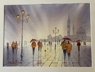 28th July 2023 – Stephen first invited members to draw along with him as he demonstrated how he quickly draws figures, creates perspective, where a vanishing point actually is! and the difference between shadows and reflections. Stephen then completed sketching a Mediterranean street scene using ink and wash. We all learnt something from a very enjoyable demonstration. Stephen kindly donated his finished artwork.